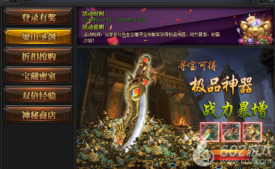 活动期间,玩家参与热血宝藏的寻宝,有几率获得极品神器,梁山圣剑,大幅度提升战斗力,助战沙城