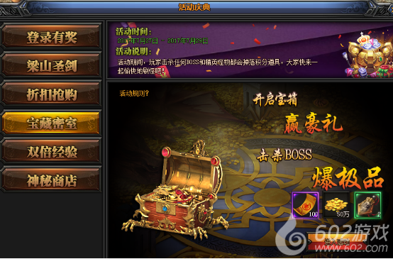 活动期间,每天晚上18点45分开启活动,活动持续15分钟。玩家可以通过面板进入活动副本,副本内,每2分钟刷新一波宝箱,开启宝箱可获得积分,累积积分达到要求可领取豪礼,每5分钟刷新一波BOSS,击杀BOSS可以获得积分并且会掉落极品道具。