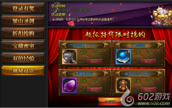 活动期间,神秘商店刷新出各种稀有道具,每2小时自动刷新一次,买完后也会刷新。