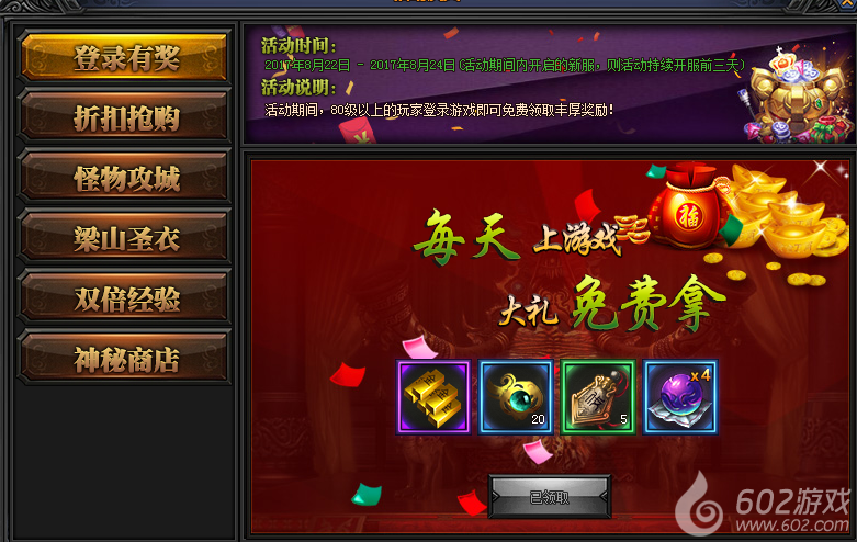 等级80级以上的玩家,活动期间登陆游戏即可领取丰厚奖励