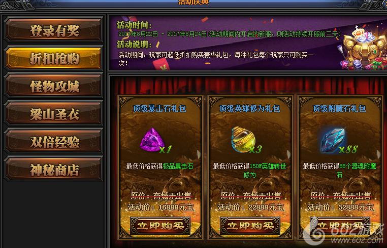 活动期间,玩家可以以超低的折扣购买礼包,每种礼包每个玩家限购一次