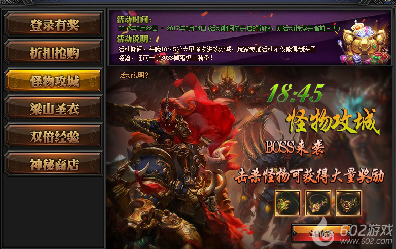 活动期间,每晚18:45,大量怪物进攻沙城,击杀怪物可活动海量经验,同时BOSS还会掉落极品装备