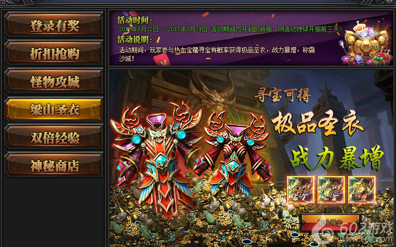 活动期间,玩家参与热血寻宝即可有几率获得梁山圣衣,圣衣附加大量属性,可大幅度提升玩家属性,助战沙城!