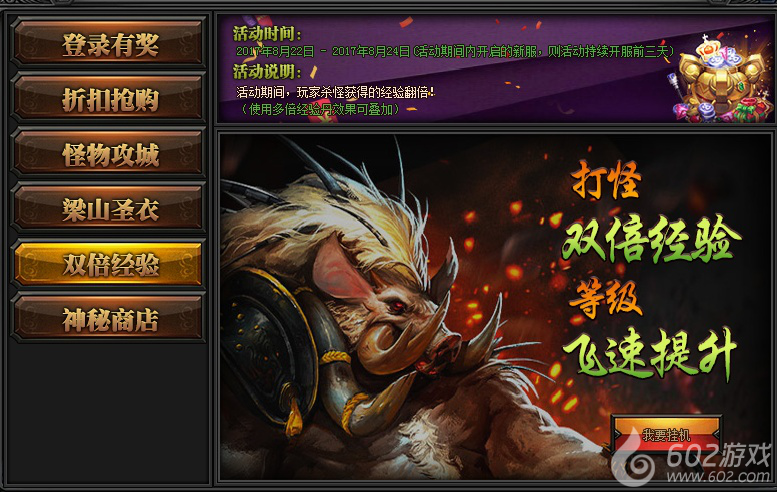 活动期间,玩家击杀怪物可活动双倍经验,多倍经验丹效果可叠加