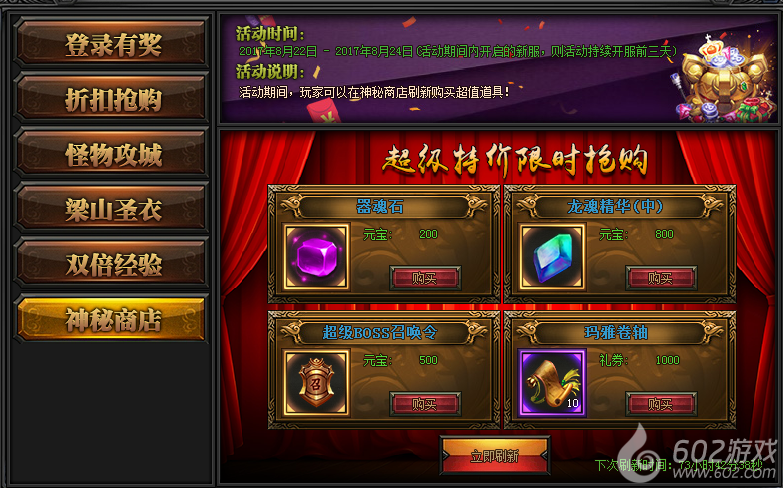 活动期间,玩家可以在神秘商店购买超值道具,神秘商店每两小时刷新一次,或者玩家购买完当前展示的道具后自动刷新